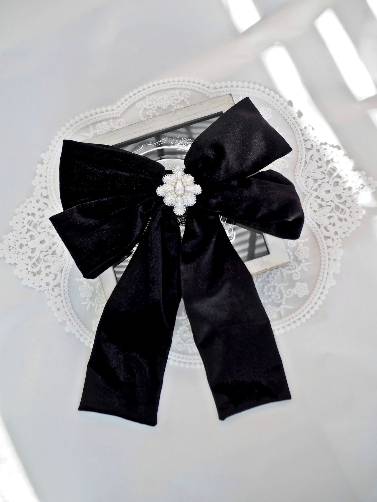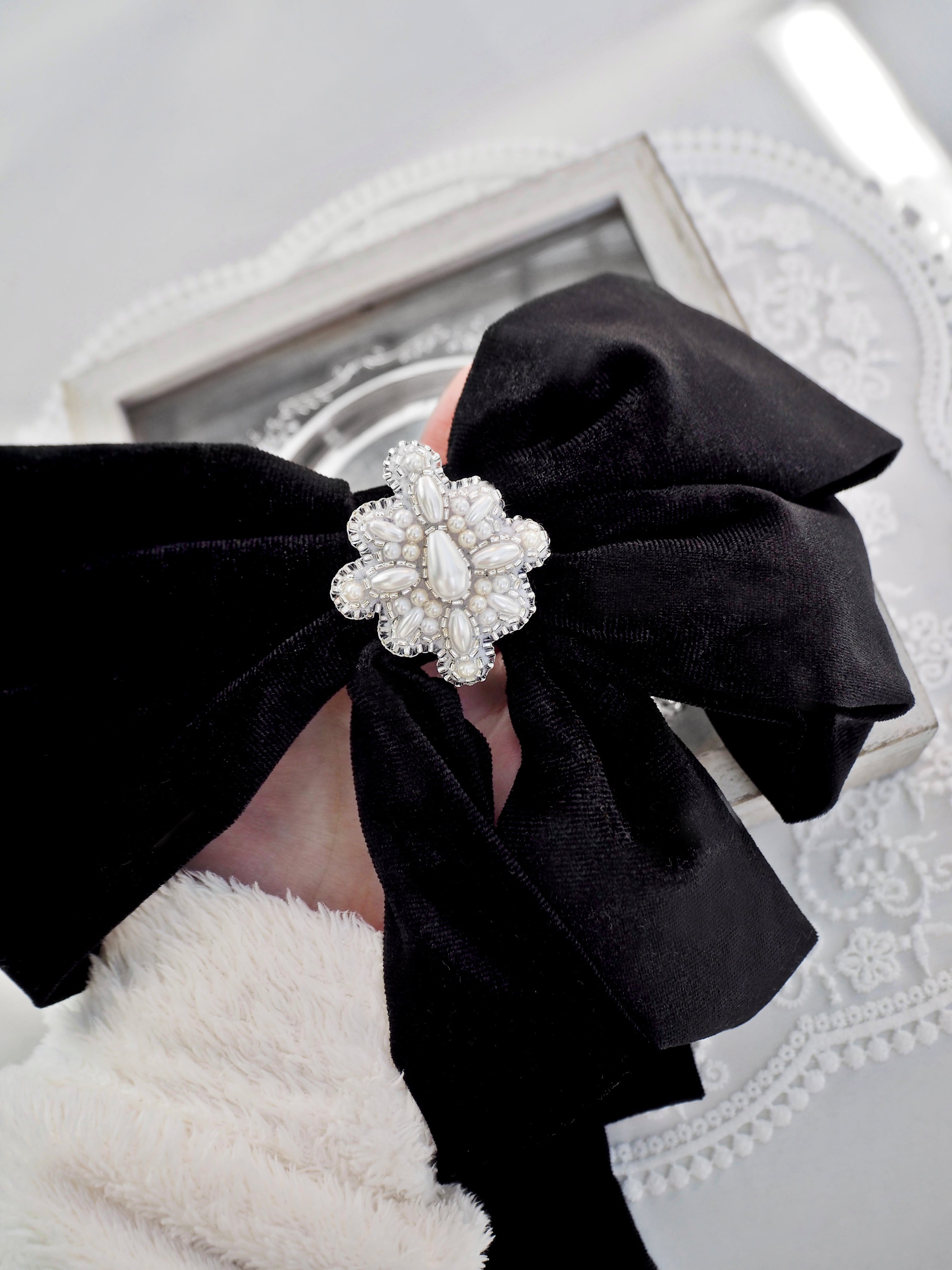 鞄や洋服、リボンのバレッタなどに着けたりと、様々なアイテムに合わせてみてください。
