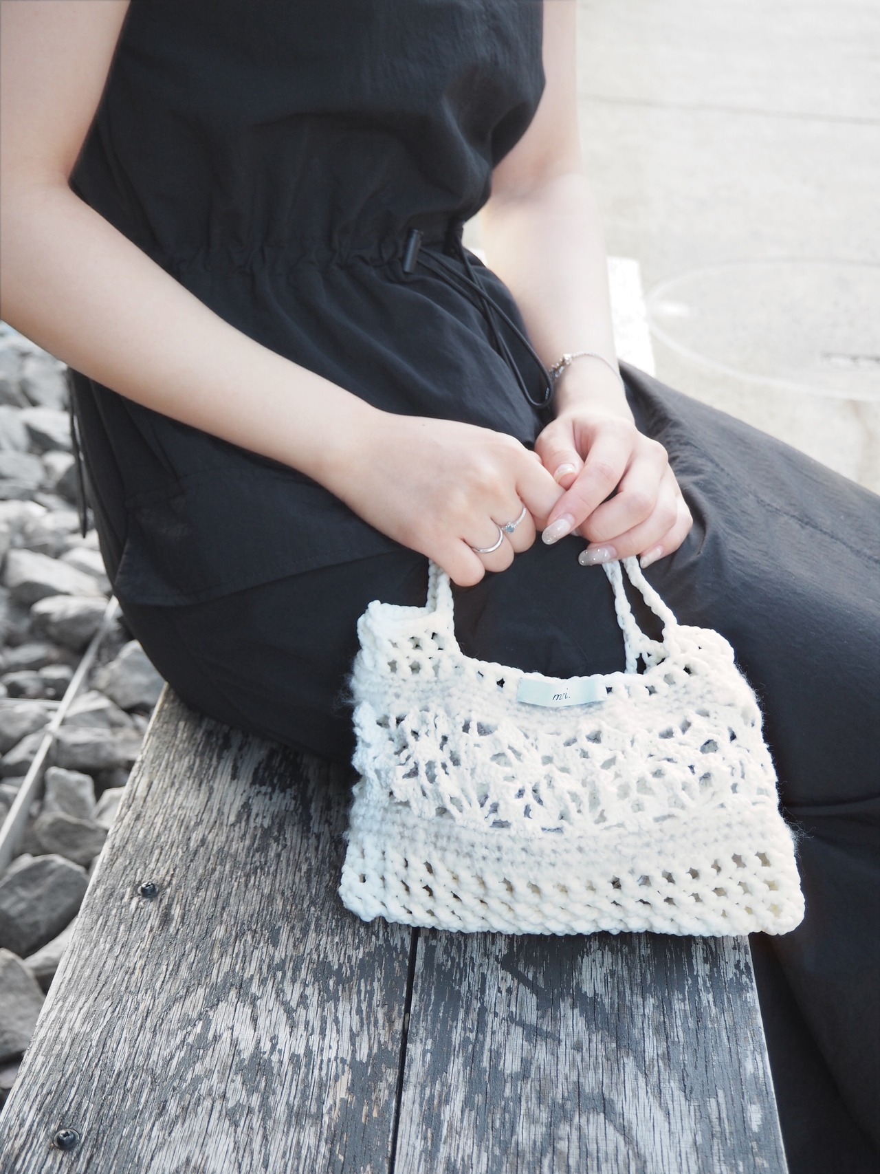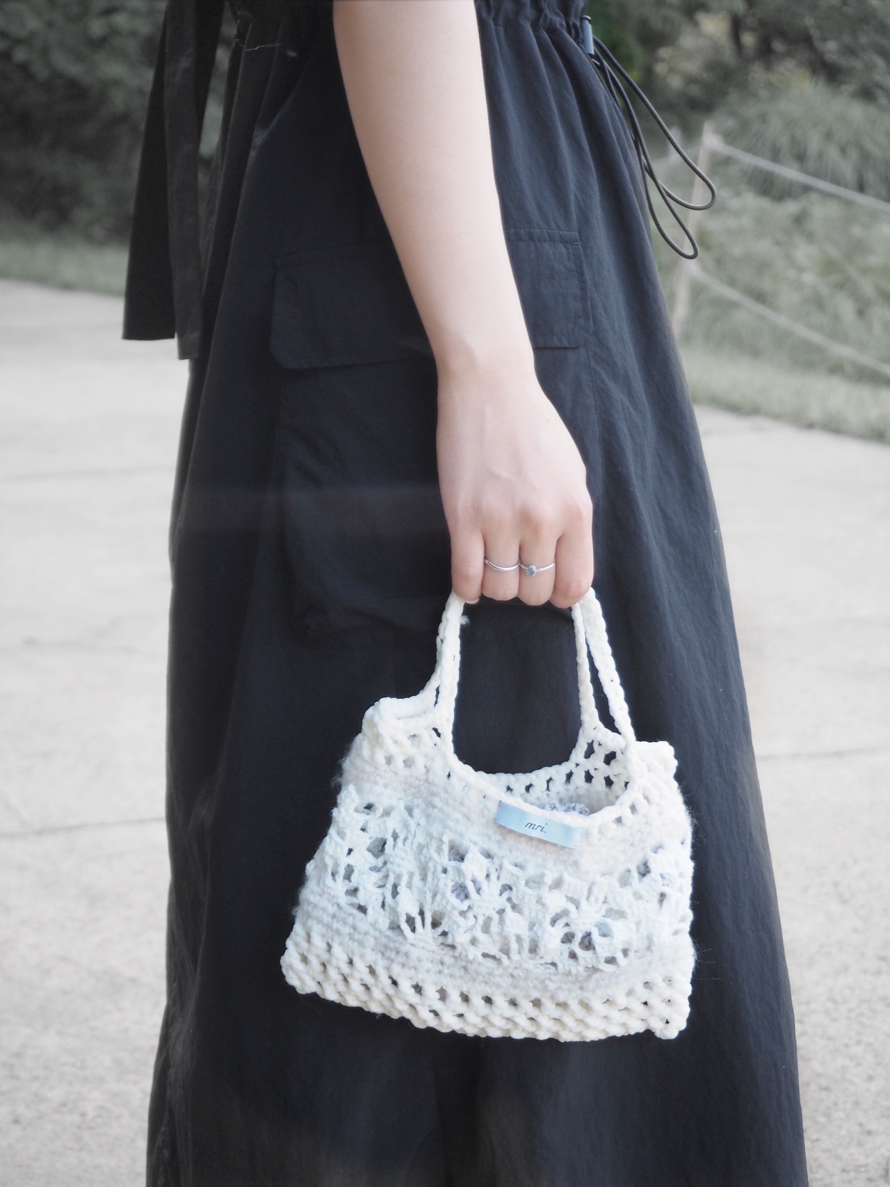 白の異なる素材の糸を使い、お花の透かし模様を編み込みました。少し上品なデザインのハンドバッグです✧꙳