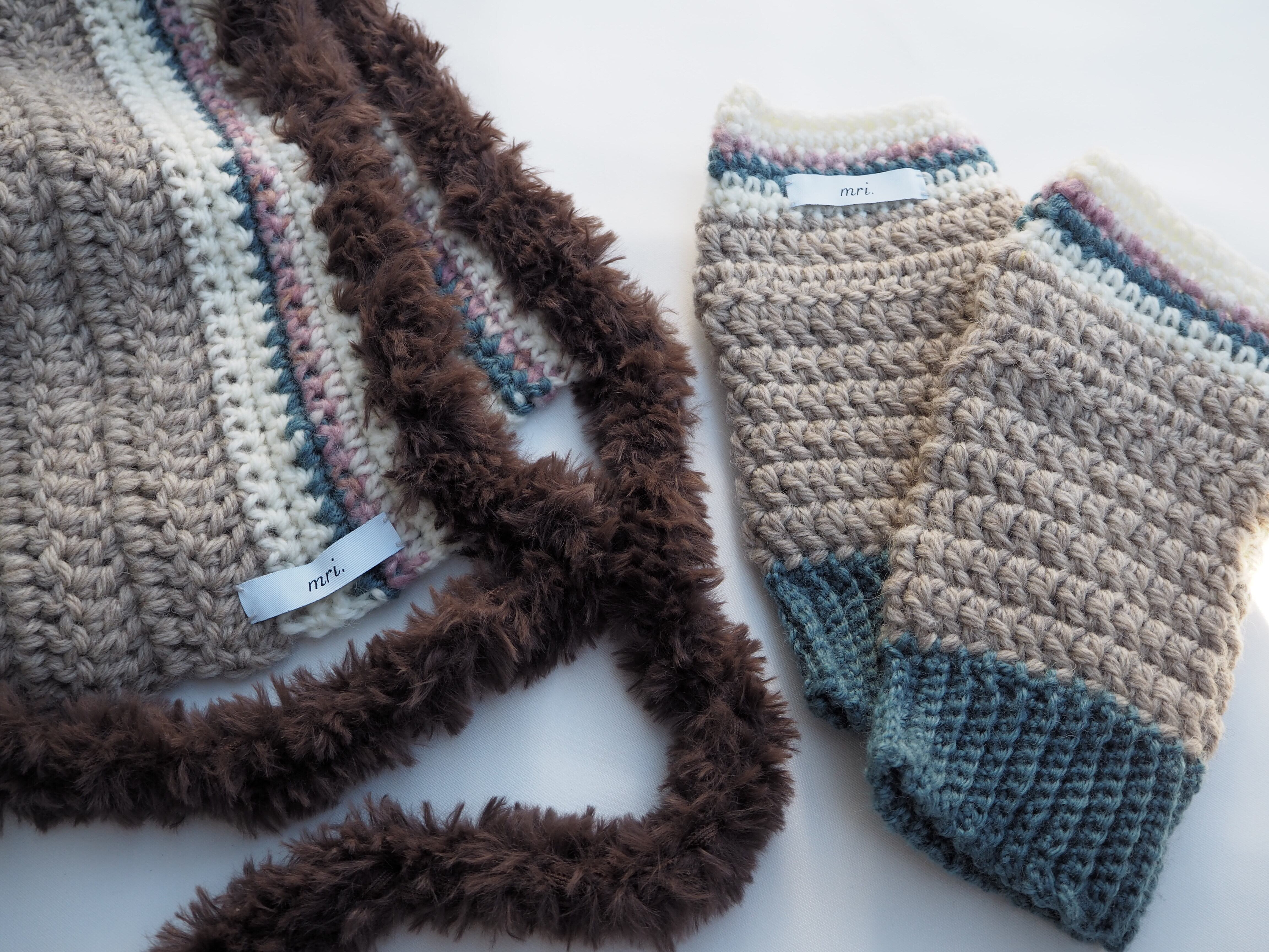 ベージュをベースにピンクとブルーを差し色として、編み上げました。