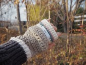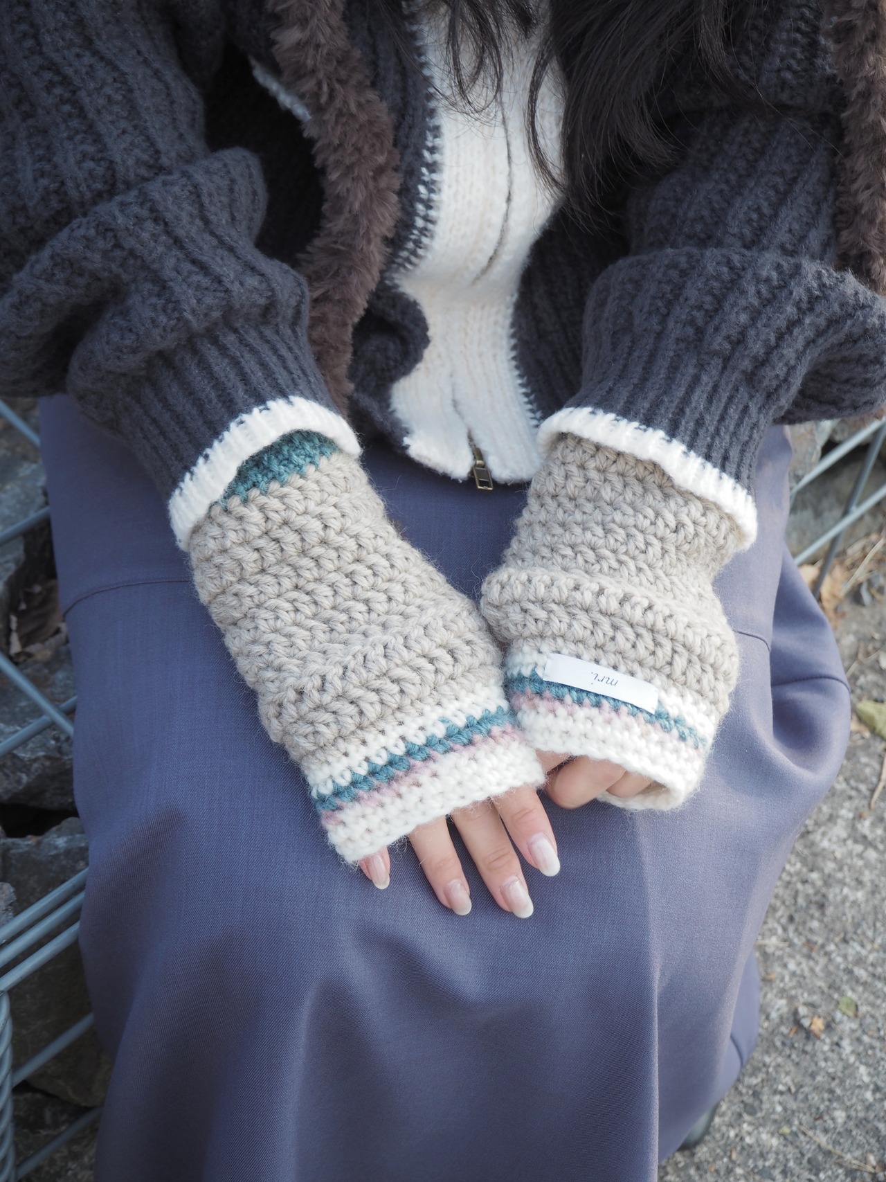 ベージュをベースにピンクとブルーを差し色として、編み上げました。