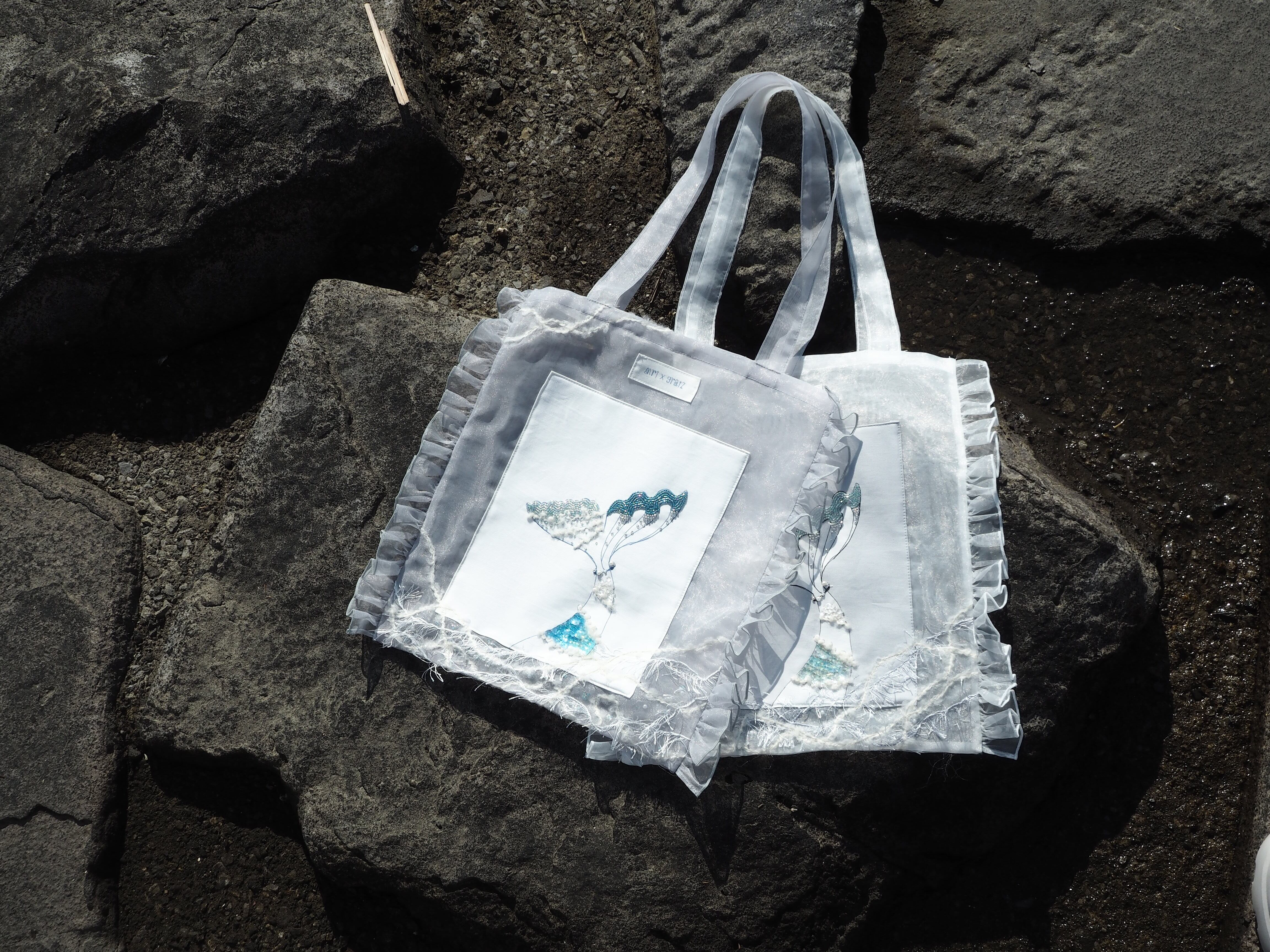 イラストに合わせて透明感のあるデザインにし、糸や毛糸で水面を表現しました