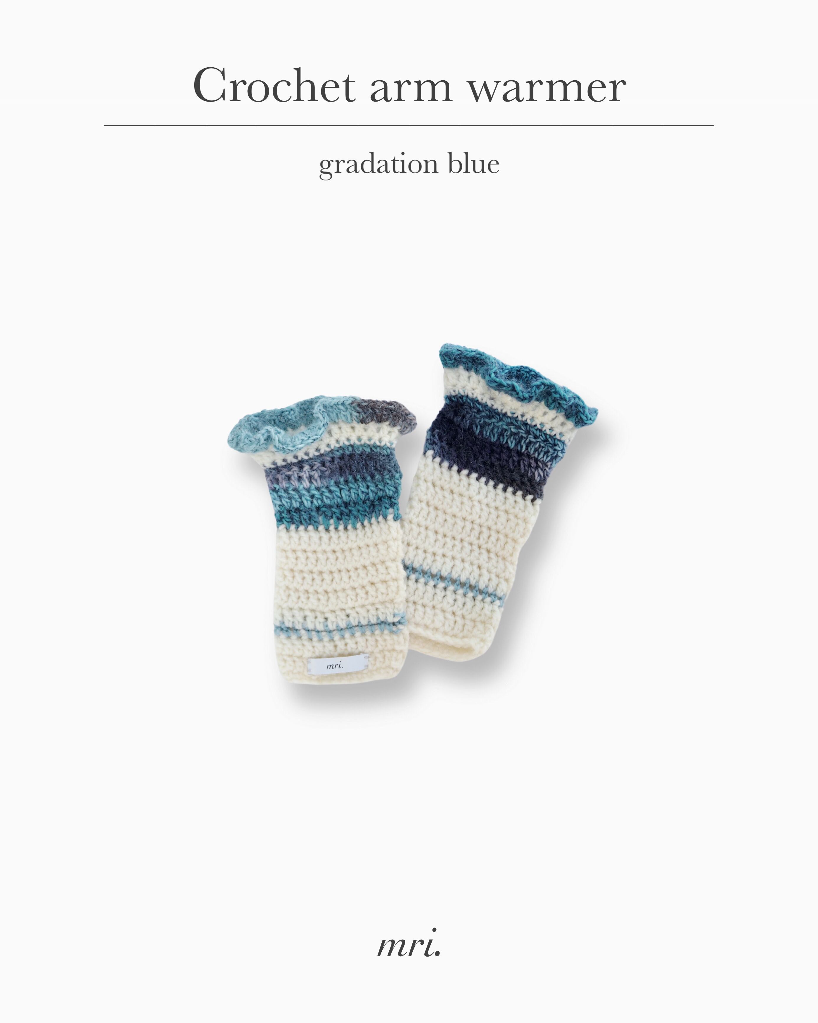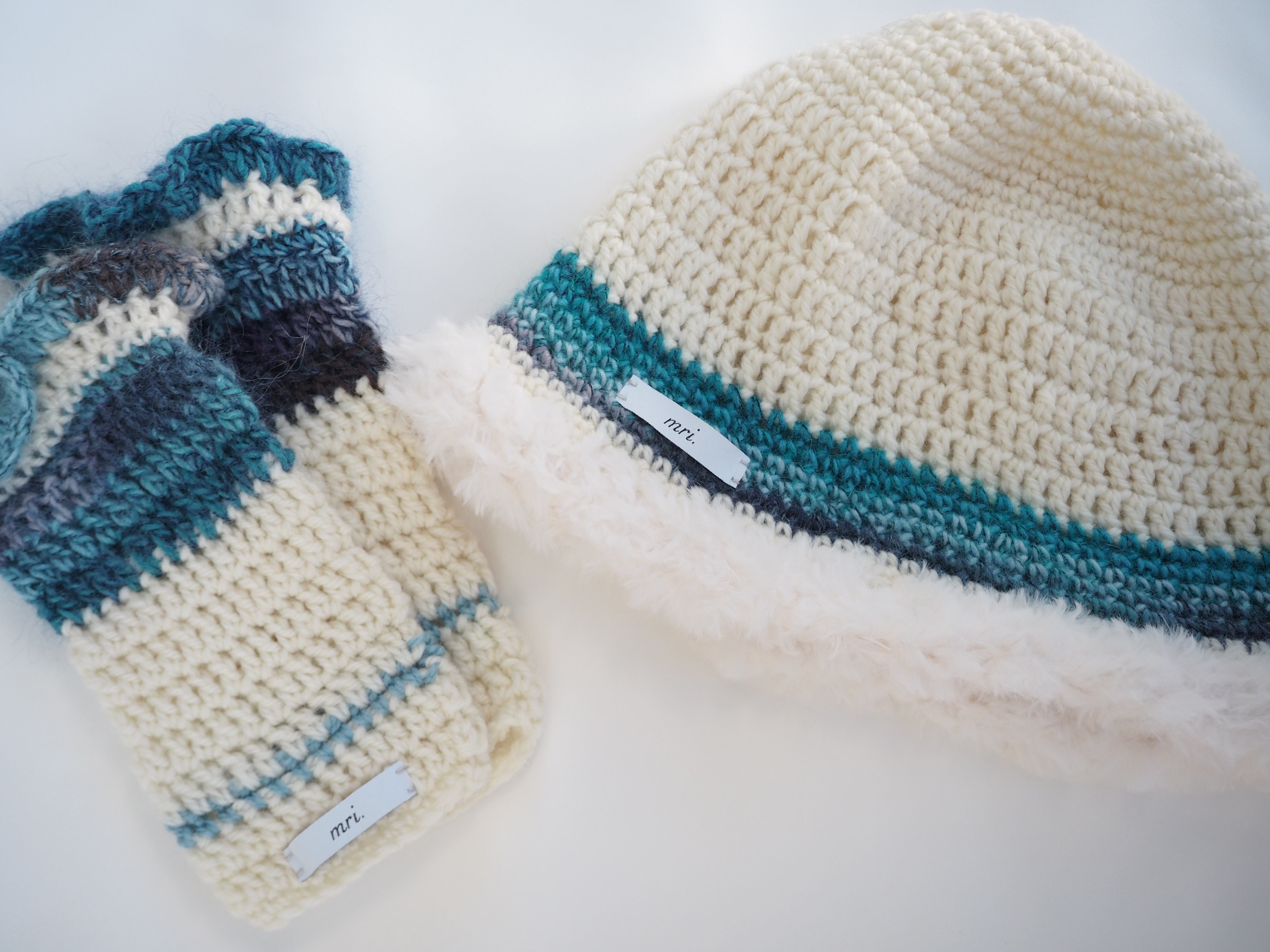 ホワイトをベースに、ブルーのグラデーションウールをポイントに編み上げました。