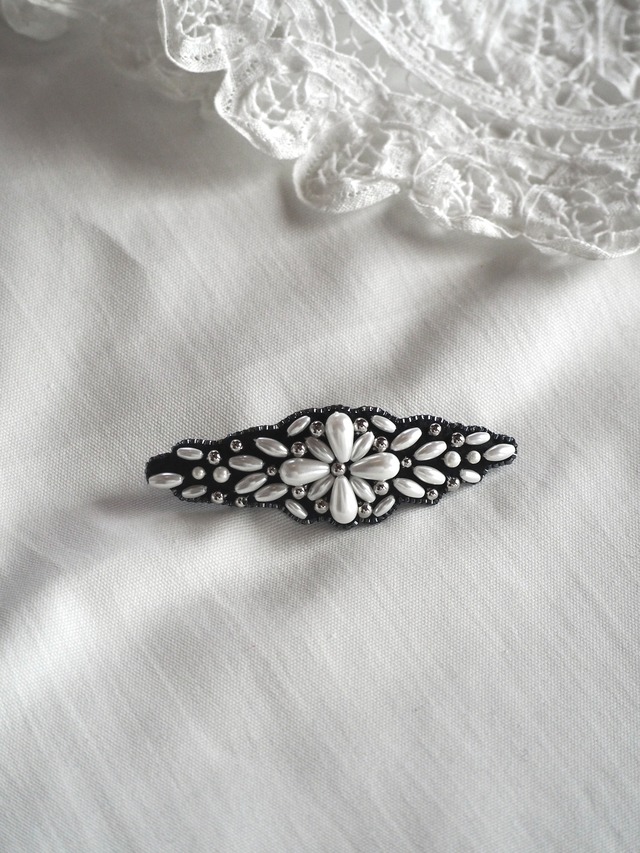 【Beaded embroidered collection 】 一粒一粒丁寧に縫い付けた ビーズ刺繍のバレッタです。 ティアラのような華やかなデザインに仕上げました .。・* ※3,4,5枚目の他デザインは、別ページで販売中です。 ※同じデザインで作成していますが、ビーズのロットの関係や手作業の関係で、ビーズの配置や色味が若干異なる場合があります。 予めご了承ください。 〈design〉 White,black 〈Size〉 white➺約7.5㎝×2.3㎝ black ➺約8.5㎝×2.5㎝ 【お取り扱い上のご注意⚠︎】 ・ビーズや金具はしっかりと縫い付けていますが、強い摩擦などで取れる場合があります。 強く引っ張ったりなどはおやめください。 ・洗濯はご遠慮ください。 【ご購入前のご注意】 ・ハンドメイド作品の為、完璧なものを求めるかた、神経質な方はご遠慮ください。 ・頂戴する配送料よりも実際の送料が下回る可能性がありますが、差額の返金はいたしかねますのでご理解をお願いします。